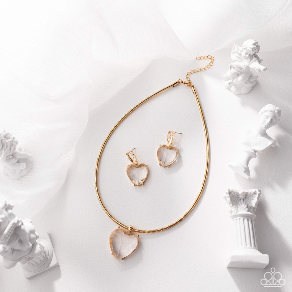 Necklace: "Faceted Finery" Pronged in gold fittings, a faceted, transparent heart-shaped acrylic swings along a glistening, gold cascade chain below the collar for a whimsical look. Features an adjustable clasp closure. Includes one pair of matching earrings.