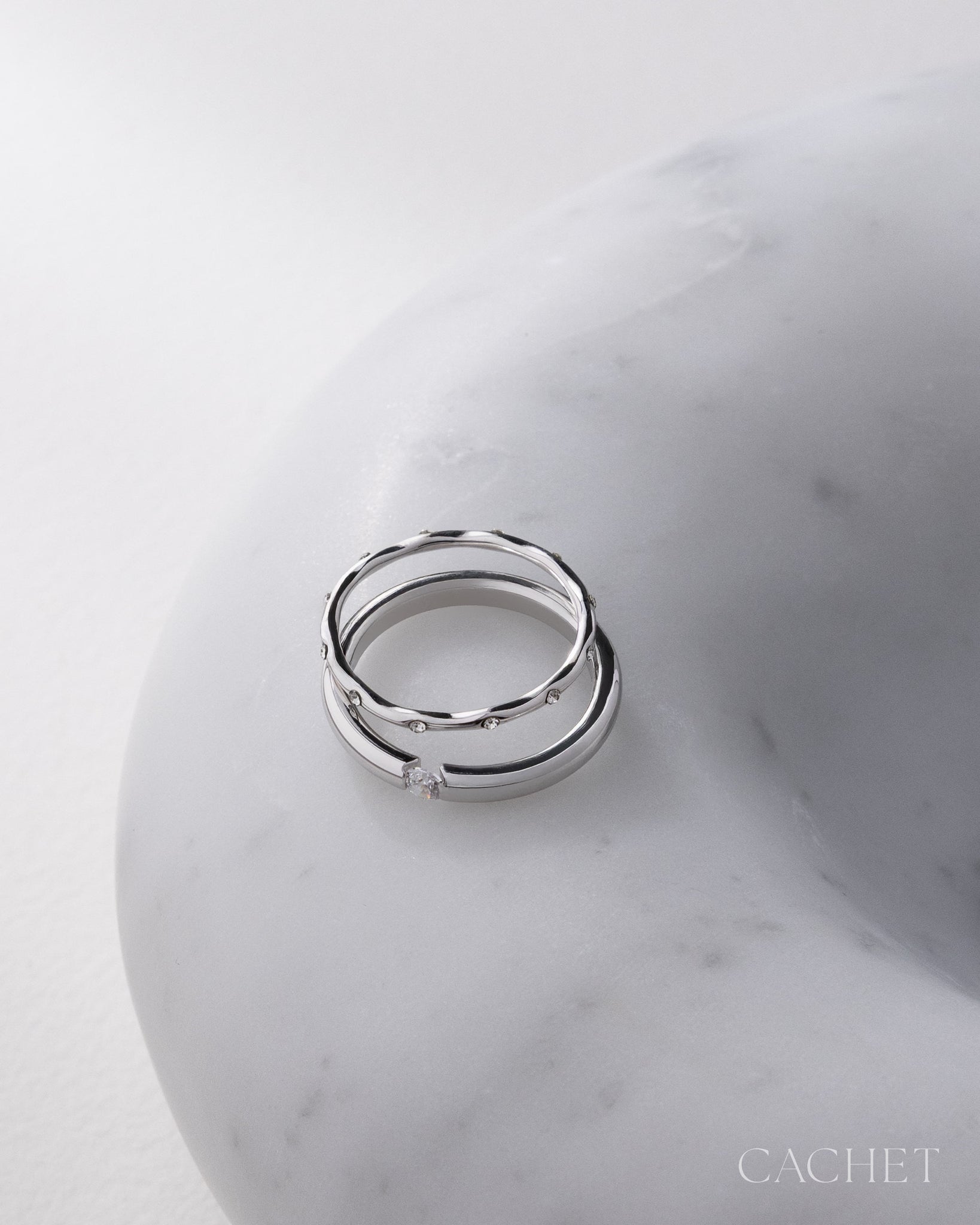 Like a dream woven in contrast, the ring "Rêve" pairs a slender, textured band dusted with rhinestone shimmer with a bolder silver counterpart, where a solo cubic zirconia accentuates that shimmer with eye-catching light and quiet allure.